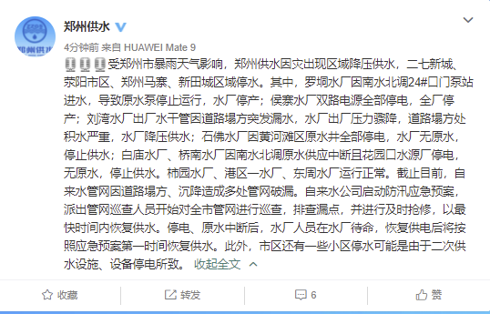 郑州自来水投资控股有限公司官方微博7月21日消息,受郑州市暴雨天气影响,郑州供水因灾出现区域降压供水,二七新城、荥阳市区、郑州马寨、新田城区域停水。