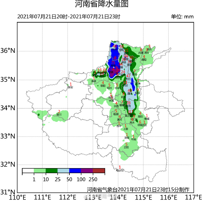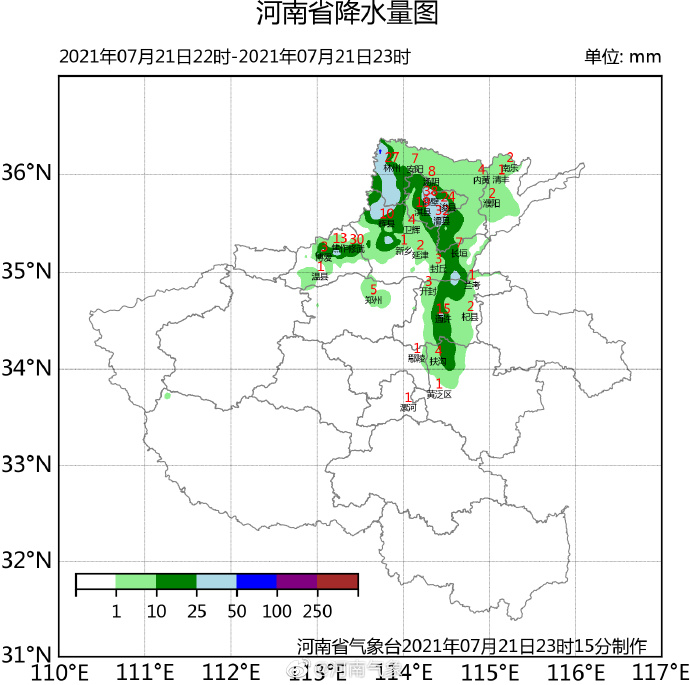 @河南气象 微博消息,21日20时至21日23时:安阳、新乡局地出现大暴雨,鹤壁、开封局地出现暴雨,焦作、周口局地出现大雨。有81个雨量站降水量超过50毫米,其中大于100毫米的有23个,最大降水量出现在新乡市牧野区牧野238.9毫米。最大小时雨强出现在新乡市牧野区牧野149.9毫米。