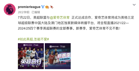 据英超官方微博@premierleague 消息,7月22日,英超联盟与爱奇艺体育正式达成合作,爱奇艺体育将成为英格兰足球超级联赛中国大陆及澳门地区独家新媒体转播平台,将全程直播2021/22—2024/25四个赛季英超联赛的全部赛事。