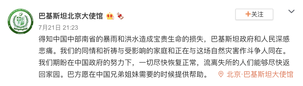 @巴基斯坦北京大使馆 微博7月21日发文:得知中国中部河南省的暴雨和洪水造成宝贵生命的损失,巴基斯坦政府和人民深感悲痛。我们的同情和祈祷与受影响的家庭和正在与这场自然灾害作斗争人同在。