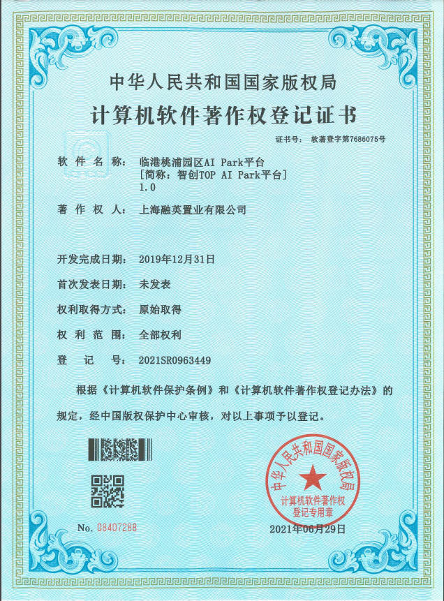 这只是智创TOP项目中AI Park (“智慧园区”)应用的一个场景。AI Park是临港集团园区数字化转型的战略举措,智创TOP作为临港集团智慧园区试点项目,与腾讯、海康威视等行业内一流企业共同合作,进行20多项前沿技术的实践,全面提升园区内智能、智联的功能布局和环境配套能力。近日,这一智慧园区项目拿到了计算机软件著作权登记证书。技术迷都知道,一纸“软著”证书是高科技企业必备的认证,而对于园区开发企业而言,拿到了这一高科技认证的“身份ID”确属凤毛麟角。这意味着,普陀这里的建筑从此多了一张“技术流”的“智慧ID”。