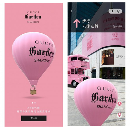 古驰甚至连观众出发地和展览目的地之间的这段路途都考虑到了。古驰特意在微信小程序增加了"AR热气球"路线引导功能,运用增强现实技术增加参与感,让观众从一开始就浸入这场趣味十足的大展。