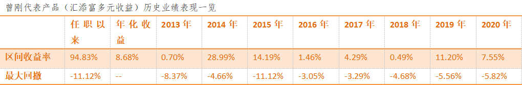 据招商证券统计,曾刚于2012年9月18日至2020年9月18日管理汇添富多元收益,任职累计收益94.83%,年化收益8.68%,在不同完整年份均实现稳定正收益,其中2014年、2015年和2019年基金收益超过10%。