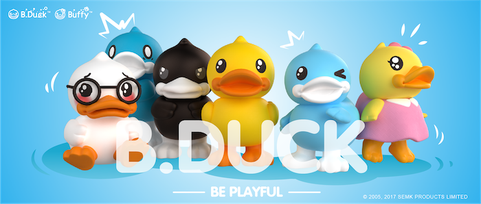B.Duck小黄鸭诞生于2005年,这是“鸭爸爸”许夏林送给孩子们的礼物,他希望创造一只快乐的小鸭子陪伴孩子成长,故此,他将自己的发型放在B.Duck身上,加上一双伶俐的眼睛和可爱的笑容,这就奠定了B.Duck的外型。