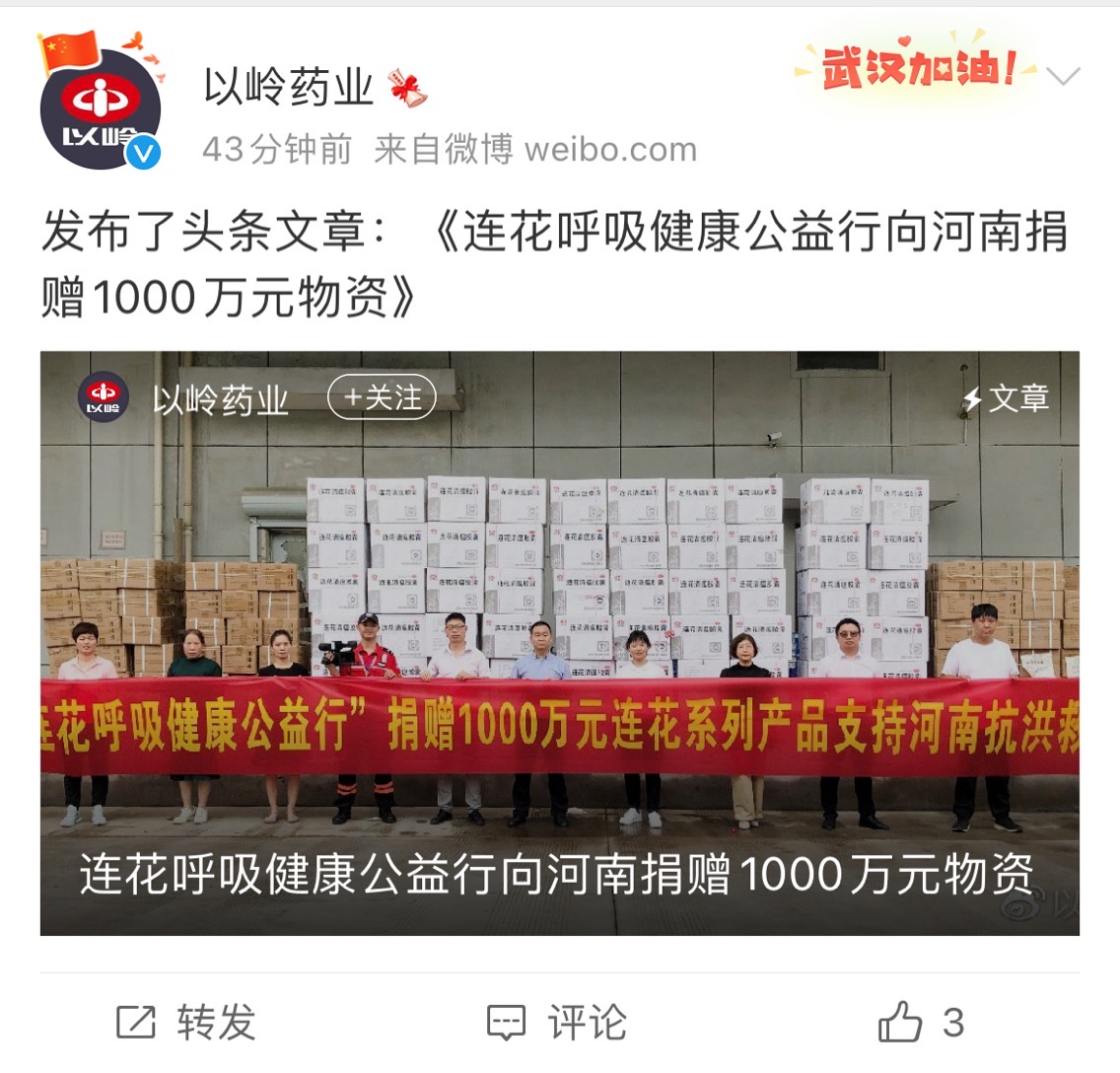 7月22日,@以岭药业 发文称,通过中国红十字基金会“连花呼吸健康公益行”项目,向河南省红十字会捐赠价值1000万元的个人防疫及消杀物资。