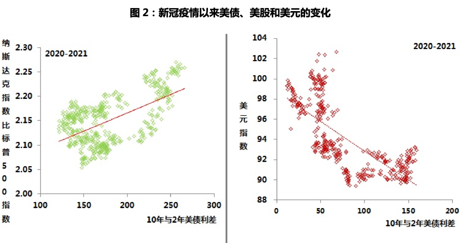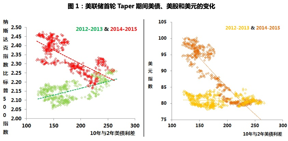 - 危机时及Taper准备时期(2012年欧债危机爆发,到2013年6月开始公开讨论Taper至2013年12月公布Taper具体计划),美债收益率曲线明显陡峭化,即长端收益率升幅明显高于短端收益率的升幅,同期美元指数相对稳定,美股中纳指表现好于标普500指数,这些均反映出市场被相对乐观的预期所主导。