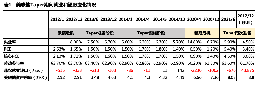类似2013年年中美联储开始吹风准备调整其购买资产的量化宽松政策——Taper,美联储于今年6月同样也开始讨论新一轮Taper实施的时机、节奏与路径。