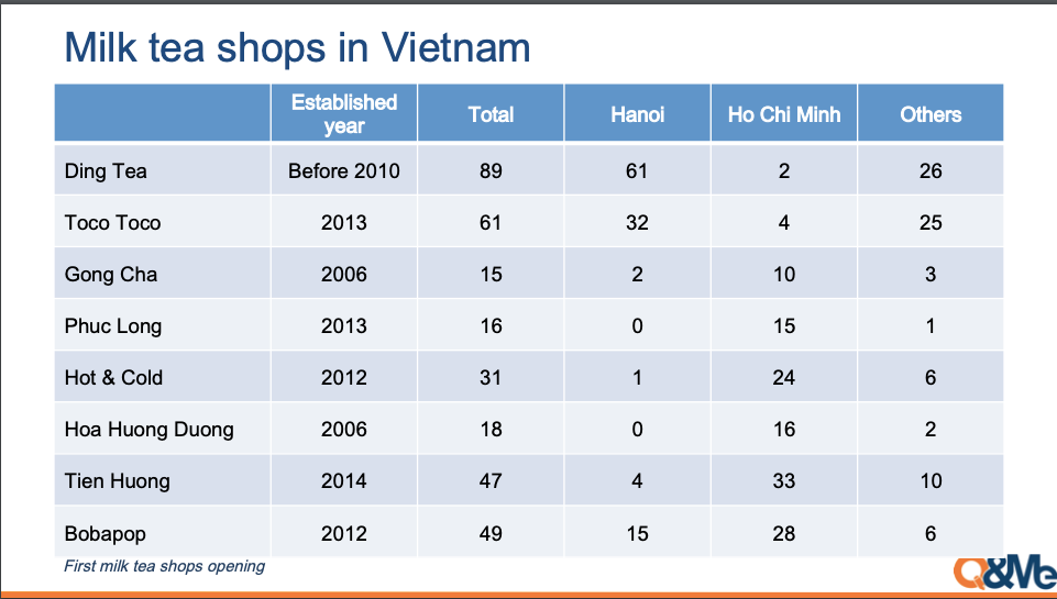 2017年,市场调研公司Q&Me在关于越南奶茶市场的一次调研中发现,薡茶、贡茶等主流的奶茶品牌都来自台湾,而越南本土Hot & Cold也渐渐赢得了一席之地。之后,来自日本、泰国、新加坡、韩国也陆续加入了越南市场的竞争。