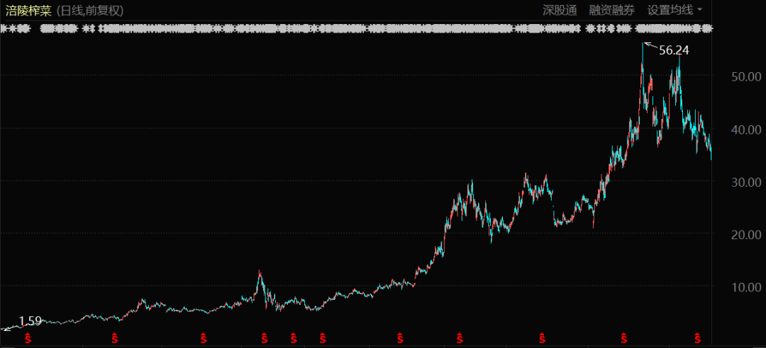 观察涪陵榨菜历年来的行情波动曲线可以发现,其股价上涨完全吻合了2012年以来中国消费经济崛起、消费升级的进程,股价从1.59元(前复权价格)涨到最高价2020年8月的56.24元,一场波澜壮阔的巨幅上涨之旅。