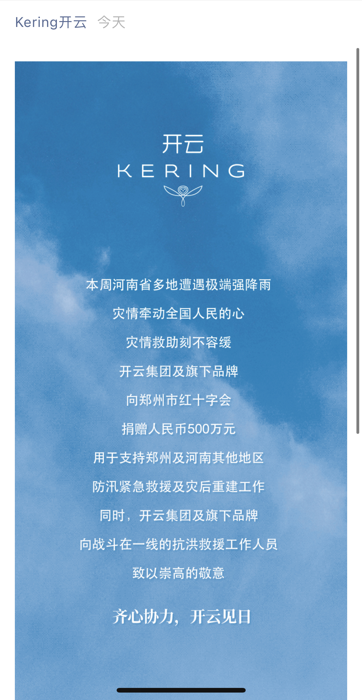 7月22日,法国开云集团(KERING)宣布,改集团及旗下品牌向郑州红十字会捐赠人民币500万元,用于支持郑州及河南其他地区的防汛紧急救援,及灾后重建工作。开云集团为Gucci(古驰)、BALENCIAGA(巴黎世家)、Saint Laurent、 Bottega Veneta等奢侈品牌的母公司。