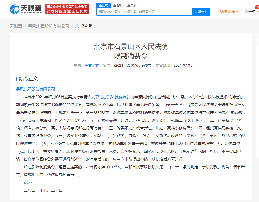 据天眼查APP显示,近日,暴风集团股份有限公司新增一则限制消费令,限制消费对象为该公司及其法定代表人冯鑫,相关案号为(2021)京0107执4976号,审理法院为北京市石景山区人民法院。天眼查APP显示,暴风集团股份有限公司已多次被限制消费。