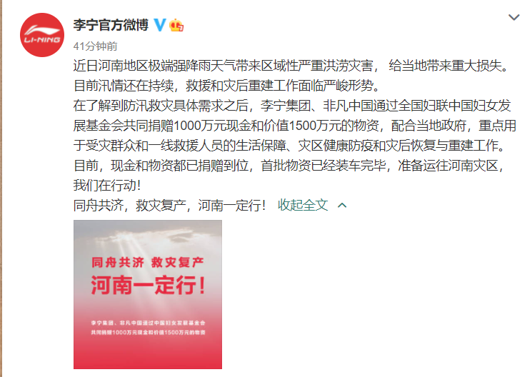 据@李宁官方微博 7月22日消息,李宁集团、非凡中国通过全国妇联中国妇女发展基金会共同向河南捐赠1000万元现金和价值1500万元的物资,配合当地政府,重点用于受灾群众和一线救援人员的生活保障、灾区健康防疫和灾后恢复与重建工作。
