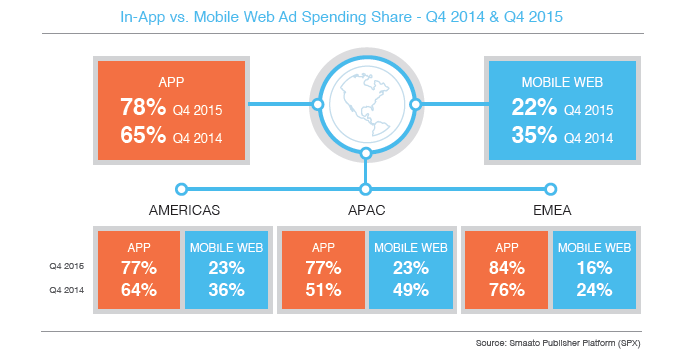 就全球移动广告而言分布而言,移动App上的广告花费正逐渐占据主导位置。根据Saamto监测数据,2015年,美国和亚太地区App上的移动广告渗透率已经高达77%,中东和非洲地区这一比例更大,达到16%。由此可见,App已逐渐成为移动广告的未来。