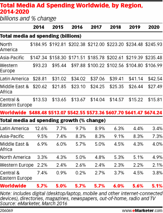 2016年全球媒体广告支出增速将达6%,亚太地区规模仅次于北美