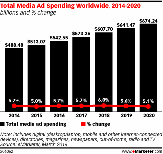得益于广告主们在媒体广告领域投入的增加,预计到2016年,全球媒体广告规模将增长至5425.5亿美元,同比增长5.7%,这一数字虽低于eMarketer早期的预测,但却仍高于其2015年5.0%的增长速度。