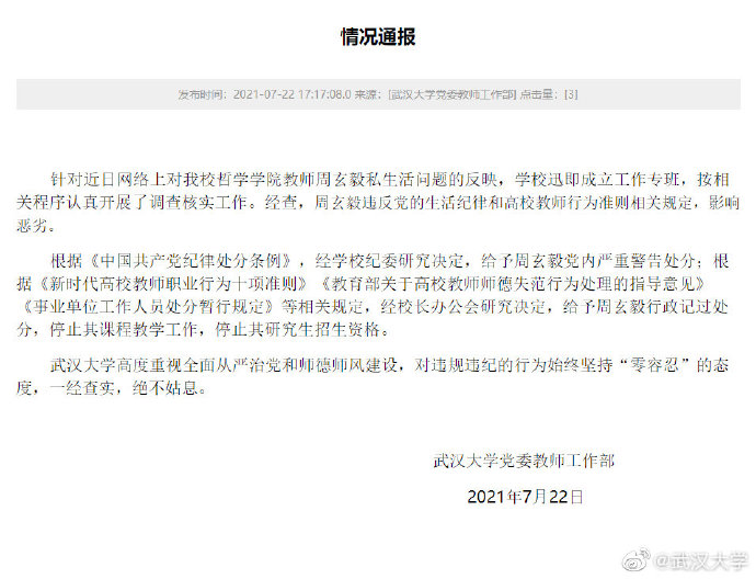 近日,武汉大学哲学学院教师周玄毅被曝同时和多个女生发生关系。武汉大学党委教师工作部网站7月22日发布情况通报,针对近日网络上对哲学学院教师周玄毅私生活问题的反映,学校迅即成立工作专班,按相关程序认真开展了调查核实工作。经查,周玄毅违反党的生活纪律和高校教师行为准则相关规定,影响恶劣。