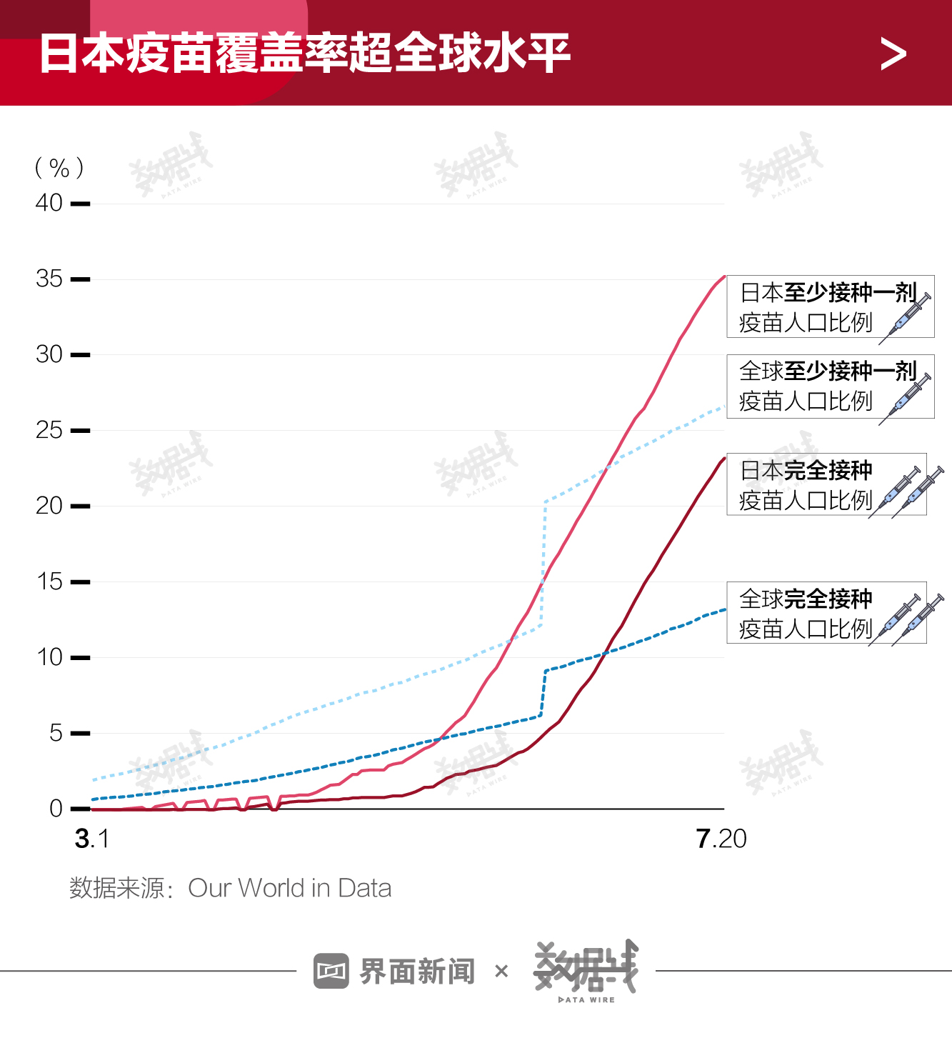 日本疫苗接种提速,疫苗覆盖率高于全球平均水平。据Our World in Data数据,6月1日至7月20日,日本至少接种一剂疫苗人口比例从10.44%增长至35.25%,增加了20多个百分点。目前(7月20日数据)已经比全球水平高出8.6个百分点。日本完全接种疫苗人口比例为23.23%,高于全球水平10个百分点。