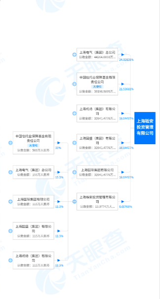 天眼查APP显示,7月22日,上海砥安投资管理有限公司(下称上海砥安)成立,注册资本为18.2亿,法定代表人为秦怿,来自上海电气(集团)总公司(下称上海电气)。