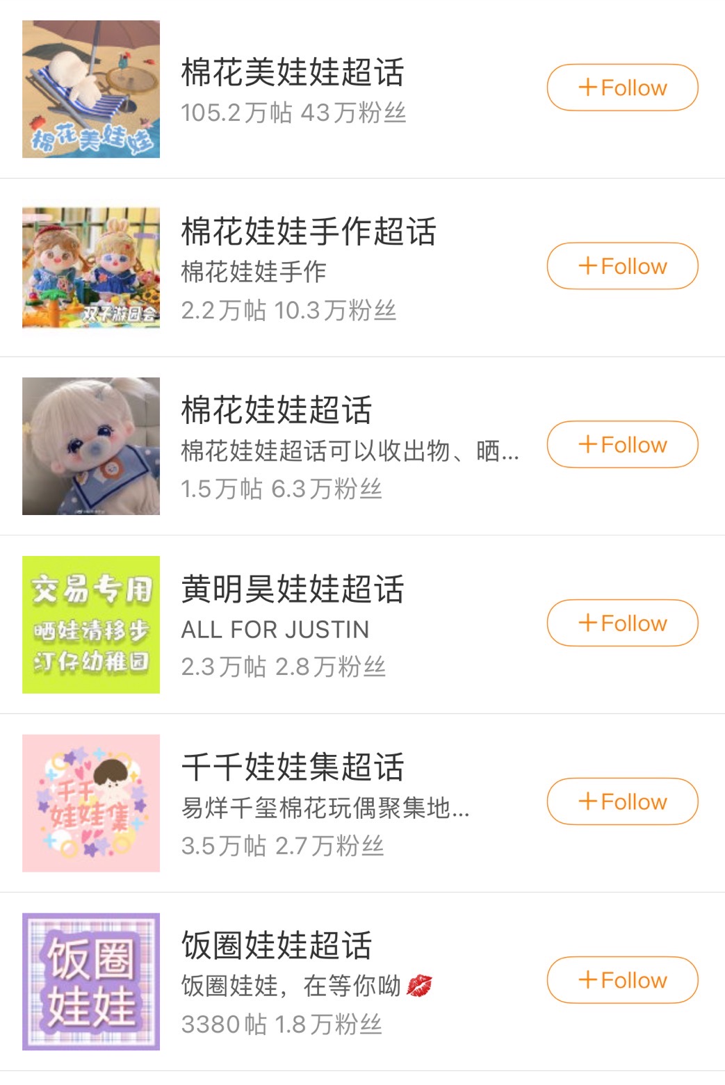 棉花娃娃的爱好者以95后、00后女生为主,她们自称“娃妈”。搜索微博,有多个棉花娃娃相关的超话,其中棉花美娃娃超话粉丝有43万,发帖量105.2万。这些超话里的内容基本都是“娃妈”们的晒娃日常,比如为娃娃们添置的“娃衣”,也就是娃娃买的衣服,另外,还有妆容教程、保养指南、店铺避雷等。