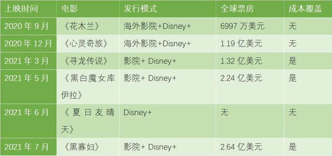虽然这些电影为Disney+带来了大量的用户与线上红利,如《黑寡妇》上映首周末全球票房2.15亿美元,其中Disney+付费收入达到了 6000万美元,而《花木兰》虽然没有公布具体收入,但上线四天流媒体观看人数统计约112万人。但是显然在院线市场上,霸主迪士尼显然收敛了很多,不追求上映数量,但求稳定。
