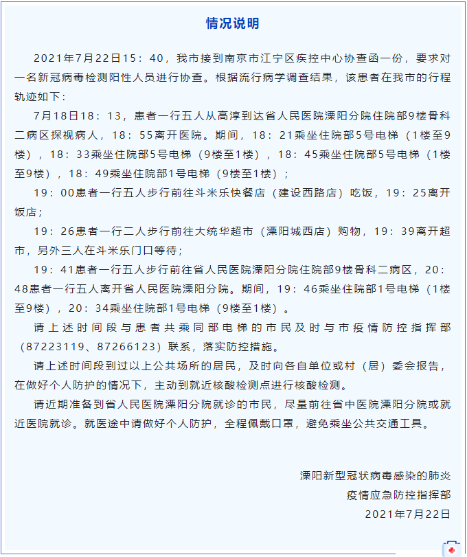 据“中国溧阳”微信公众号7月22日消息,溧阳新型冠状病毒感染的肺炎疫情应急防控指挥部通报,7月22日15:40,溧阳市接到南京市江宁区疾控中心协查函一份,要求对一名新冠病毒检测阳性人员进行协查。根据流行病学调查结果,该患者在溧阳市的行程轨迹如下: