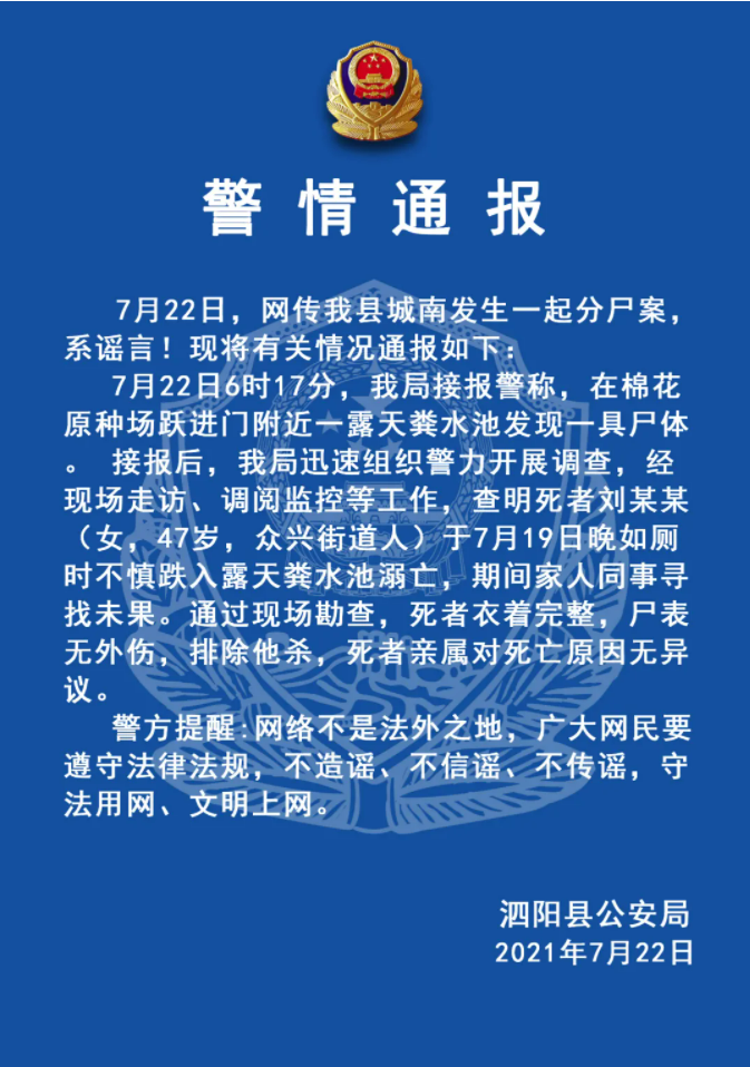 当日6时17分,泗阳县公安局接报警称,在棉花原种场跃进门附近一露天粪水池发现一具尸体。接报后,该局迅速组织警力开展调查,经现场走访、调阅监控等工作,查明死者刘某某(女,47岁,众兴街道人)于7月19日晚如厕时不慎跌入露天粪水池溺亡,期间家人同事寻找未果。通过现场勘查,死者衣着完整,尸表无外伤,排除他杀,死者亲属对死亡原因无异议。