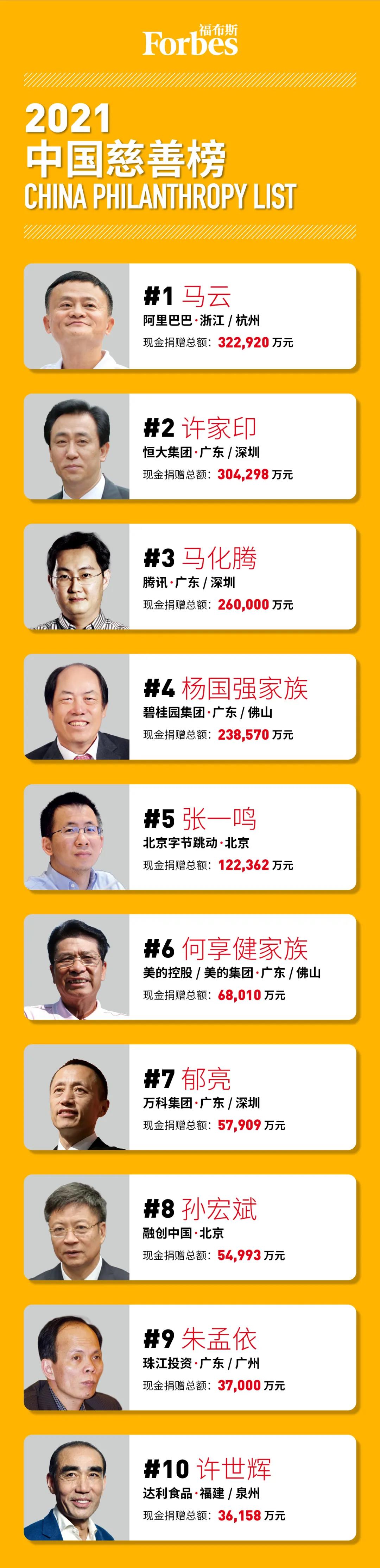 福布斯中国研究了中国民营企业家及企业在2020年度向公益慈善领域的现金捐款情况,并将企业家及其管理企业的捐款额合并计算,编制年度中国慈善榜。每年有100位企业家(企业)入选该榜单。