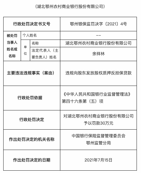 7月23日,鄂州银保监分局日前发布的行政处罚信息公开表显示,湖北鄂州农村商业银行股份有限公司因违规向股东发放股权质押反担保贷款,被处罚款30万元。