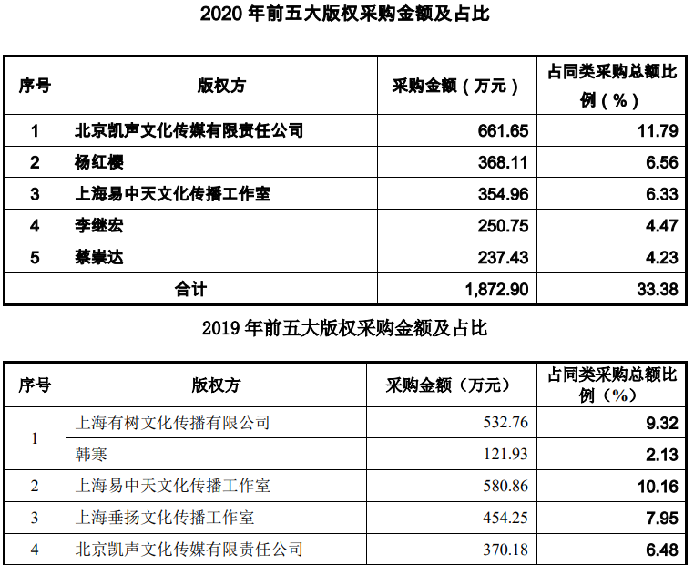 果麦文化近三年的前五大版权供应商,其中有树文化是韩寒的亭东影业全资子公司,除代理运营韩寒版权外也有图书销售业务