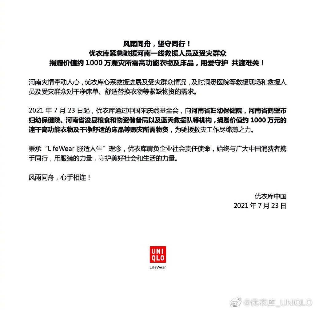 据@优衣库_UNIQLO 微博消息,7月23日起,优衣库通过中国宋庆岭基金会,向河南省妇幼保健院、河南省鹤壁市妇幼保健院、河南省浚县粮食和物资储备局以及蓝天救援队等机构,捐赠价值约1000万元的衣物及床品等物资。