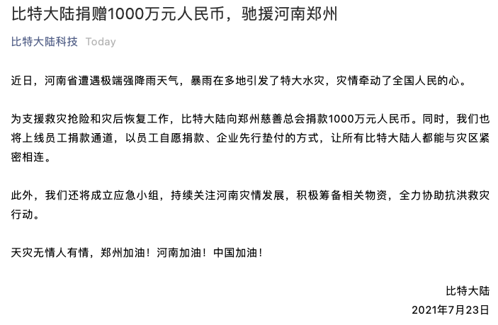 “比特大陆科技”微信公众号7月23日消息,近日,河南省遭遇极端强降雨天气。为支援救灾抢险和灾后恢复工作,比特大陆向郑州慈善总会捐款1000万元人民币。