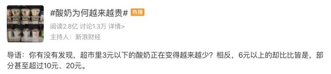 6月底,一条微博热搜引发热议:“超市里3块钱以下的酸奶正在变少,6元以上的比比皆是,部分甚至超过10元、20元”。这个话题短时间内就引爆2.8亿的阅读量。