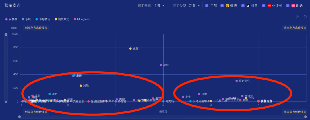 时趣洞察引擎分析了五个高端酸奶品牌,在近3个月内的卖点全貌图后发现:坐标左下侧的红圈,主要代表的是「低竞争力且低传播力」的营销卖点;右侧下方红圈是「高竞争力、低传播力」的营销卖点。