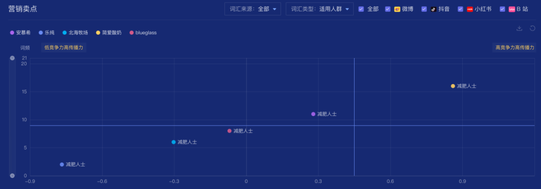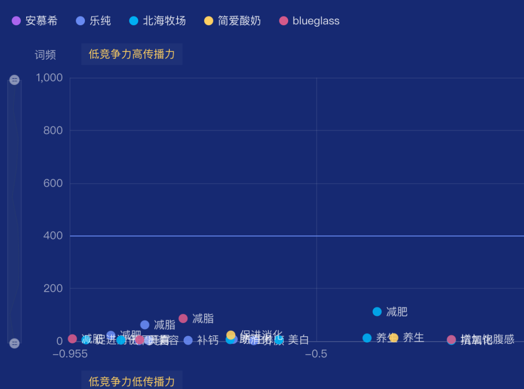 通过拉大这个坐标图,洞察引擎发现,越靠坐标左下侧的营销卖点,事实上是竞争非常激烈的区域,几家全部都聚焦在健康、减脂、减肥这几个维度。