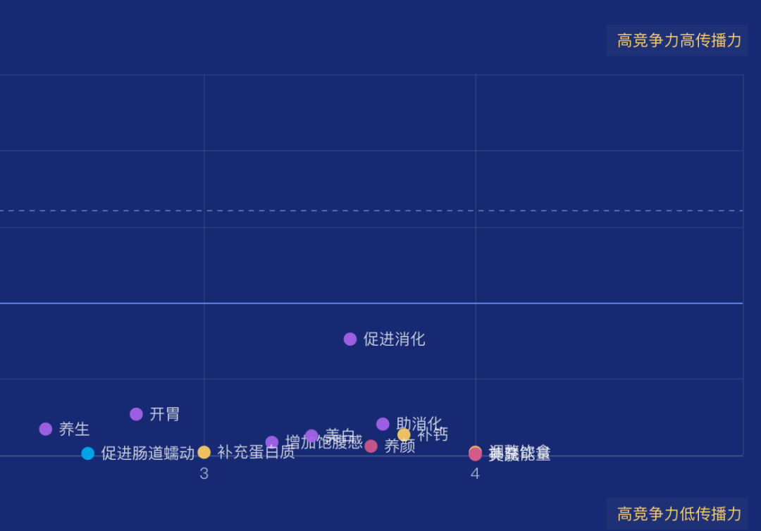 但如果看右侧下方,其实有一些卖点非常具有竞争力,比如助消化、调整饮食、养颜等一些新卖点的出现,但从传播效果上来说,这些卖点的传播力还偏低,消费者教育有着很大的上升空间。
