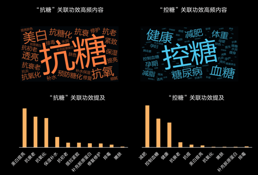 在第四步,洞察引擎根据产品的「无蔗糖」特质,延伸出关联度最高的两个护肤理念「抗糖」、「控糖」,对这个两个词进行分析后发现:抗糖主要集中在美妆护肤领域,抗糖主要集中在减肥、健康理念。