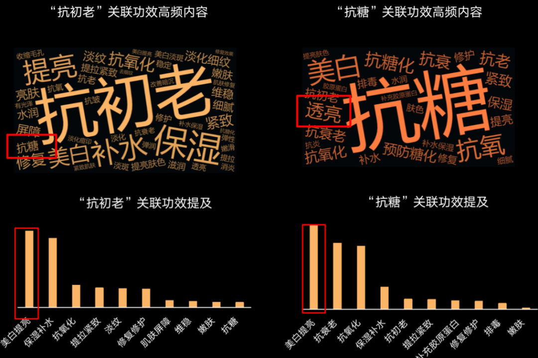 同时,在分析「抗糖」的关键数据后发现:抗初老年轻人群,符合品牌TA,以及和提及「抗糖」人群之间有较高的关联。从而又进一步分析了「抗初老」人群。