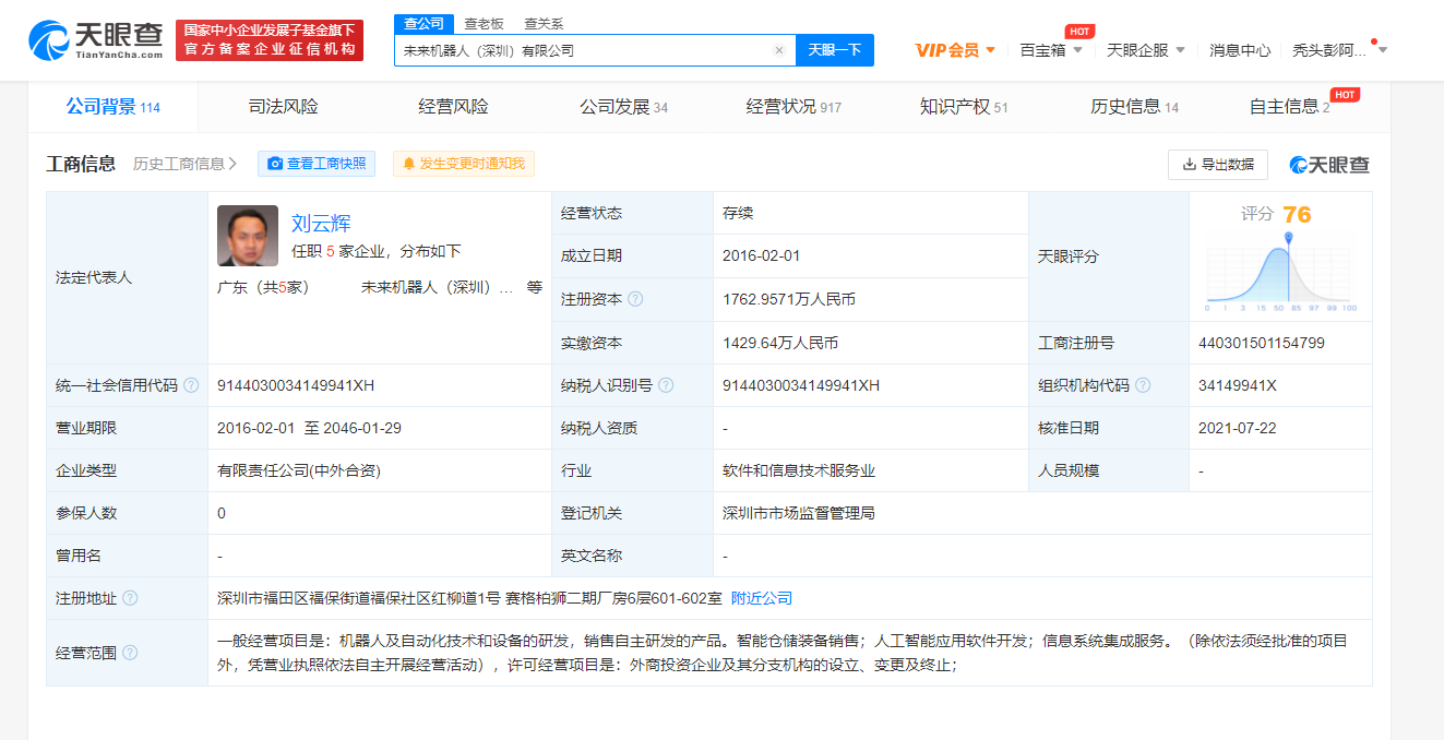 据天眼查APP显示,近日,未来机器人(深圳)有限公司发生多项工商变更,注册资本增至约1762.9571万人民币,增幅约10.38%;股东新增字节跳动关联公司北京量子跃动科技有限公司等。未来机器人(深圳)有限公司成立于2016年2月1日,法定代表人为刘云辉,经营范围包括机器人及自动化技术和设备的研发,销售自主研发的产品。