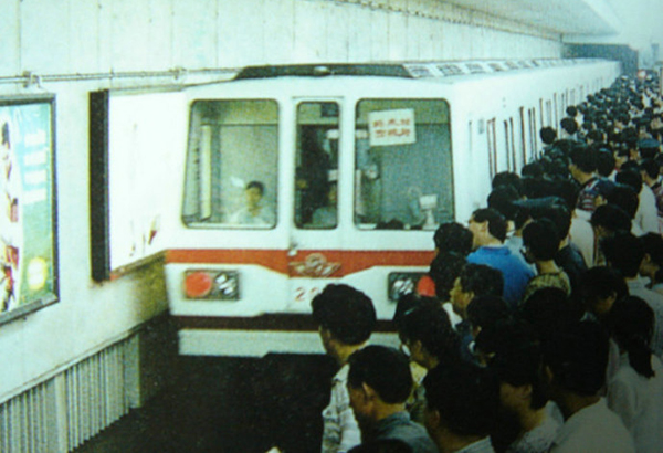车厢里衣服的颜色还是蓝绿为主,客流也堪比现在的晚高峰了。