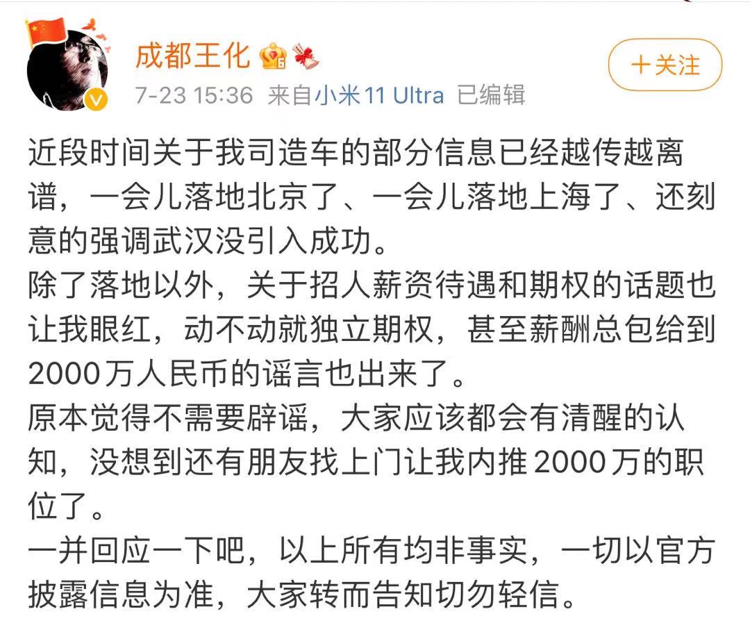 7月23日消息,针对网上热议的小米汽车研发落地及高薪引进人才等话题,小米公关部总经理@成都王化 发文表示:“以上所有均非事实,一切以官方披露信息为准。”