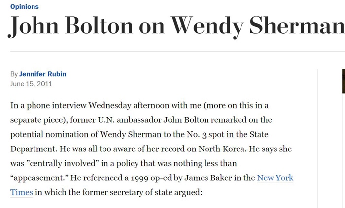 但包括特朗普时期的国家安全顾问博尔顿在内的鹰派批评者认为,舍曼对朝鲜的谈判策略只是在搞“绥靖政策”,导致美国无法在朝鲜问题上采取更强势措施。