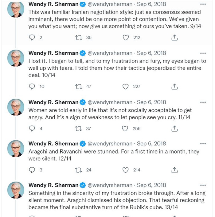2018年,舍曼还在Twitter发文,透露自己曾在伊核谈判期间落泪。她称当各方马上要达成一致时,又出现了新的分歧点,出于愤怒和沮丧,“我的眼睛充满了泪水,我向他们指出他们的策略如何破坏了整个协议。”