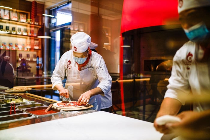 城市大道红炉披萨烘焙坊是首次在美国之外的地区亮相。走进这家餐厅,可以看到店内的装修设计以红白为主,充满火红热情的意大利味道。