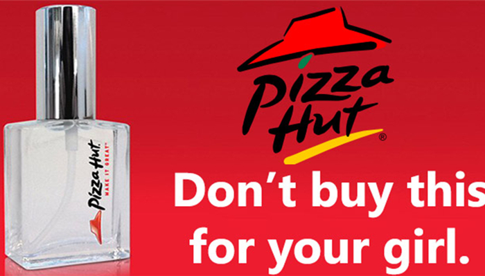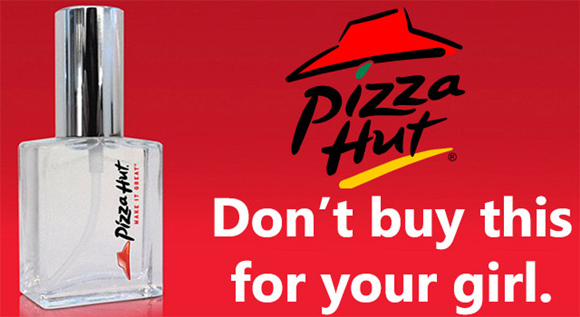 大多数人喜欢披萨的味道,但是他们真的喜欢自己散发出一股披萨味吗?2012年,必胜客在加拿大就推出了一款披萨味的香水。起初,这些香水只是作为礼物送给必胜客的Facebook粉丝的,一共只有100瓶。但在第二年,必胜客又推出了这款香水,作为情人节营销。