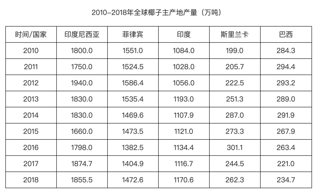 在原材料供应上,目前全世界范围内的椰子年产量都存在很大的波动性。根据智研咨询的数据,2014年世界椰子的年产量还在6144.6万吨,到了2015年突然滑落到5942吨,到了2016年尽管有所回升,也没能回到2014年的产量。