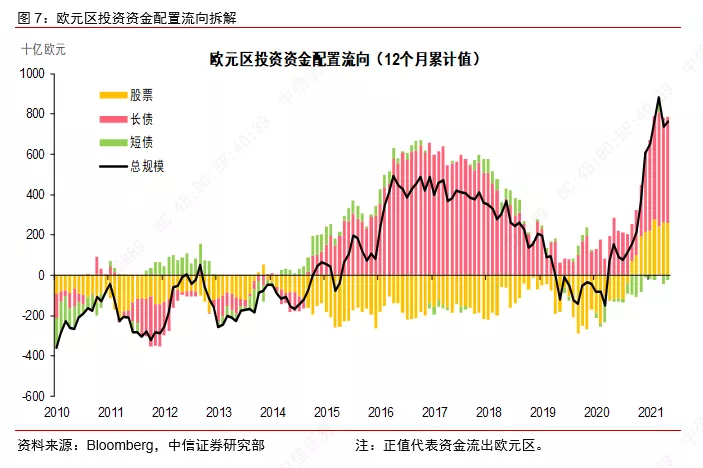 从欧元区投资组合资金配置流向数据来看,自欧央行去年底加速资产购买以来,欧元区投资组合资金便开始逐步流出欧元区,起初配置在权益组合的资金较多,但3月份后配置长债的资金流出量增加。截止最新2021年5月的单月数据显示,组合配置长债的资金流出欧元区约873亿欧元,相比Q1呈现加速流出欧元区。