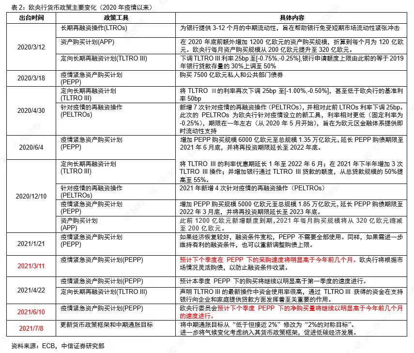 欧央行二十年来首次修改通胀目标,改为“中期2%的对称目标”。2021年7月8日,欧央行在新一轮的政策战略审查中将中期通胀目标从“低于但接近2%”修改为“2%的对称目标”,并允许必要时通胀适度高于2%一段时间。这一转变是向鸽派迈进了一步,表达了对通胀回升的耐心。类似美联储,欧央行认为通胀上升是暂时的,不过其强调工资疲软、中期通胀前景远低于欧央行的目标,这意味着欧央行宽松的时间将长于美联储。
