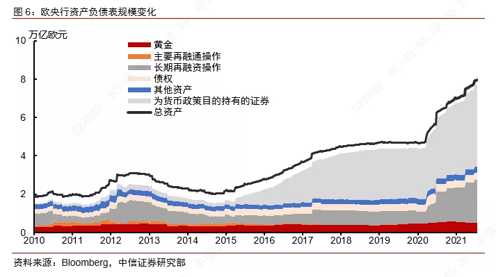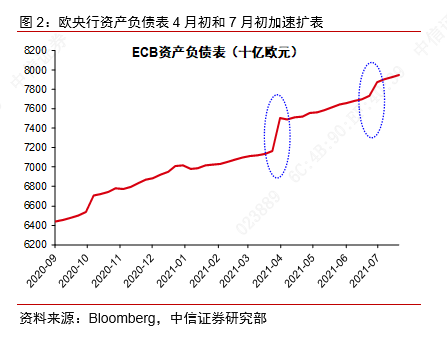 欧央行今年以来在资产购买方面的力度不断加大。对于欧央行来说,目前资产购买的形式主要分为两种,一种是常规的QE,一种是针对疫情的QE。从去年欧洲疫情爆发后的3月开始,欧央行增加了QE额度至全年1200亿欧元,每月购债规模从200亿欧元/月提升至320亿欧元/月。今年7月22日最新的议息会议上,欧央行声明称将长时间延续每个月200亿的购债规模,可能会在下一次加息之前不久结束,也就意味着当前常规购债计划至少维持至2022年之后。另一方面,针对疫情的紧急资产购买计划(PEPP)是当下的主要购债工具,去年底欧央行增加了PEPP购买规模5000亿至总规模1.85万亿欧元,延长PEPP购债到期时间至2022年3月底。PEPP是目前欧央行灵活购债的主要抓手。在今年3月和6月的议息会议上,欧央行均提出将加快PEPP 的购买速度(将明显高于今年前几个月)。结合PEPP的灵活性,欧央行后续购债规模还可能进一步提升。