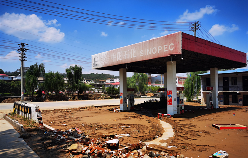 在这种情况下,刘松峰只能开着铲车穿越激流进入加油站。他一边缓慢前行,一边用前斗试探水深,待铲车完全进入激流时,他调整方向让铲车顺水而下,试图让冲击力降低到最小。