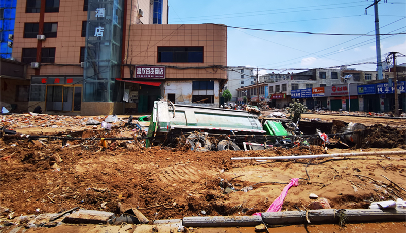 刘松峰跟村委人员以及水泥厂工人赶紧跑到几百米外的国道查看,发现两辆大巴车在激流的冲击下来回摇摆,一辆被冲进了附近的加油站,另一辆则被冲到公路对面的堤坝旁。看到有人前来,车里的人们开始大声呼救,还有人则摇摇晃晃地坐在车顶。